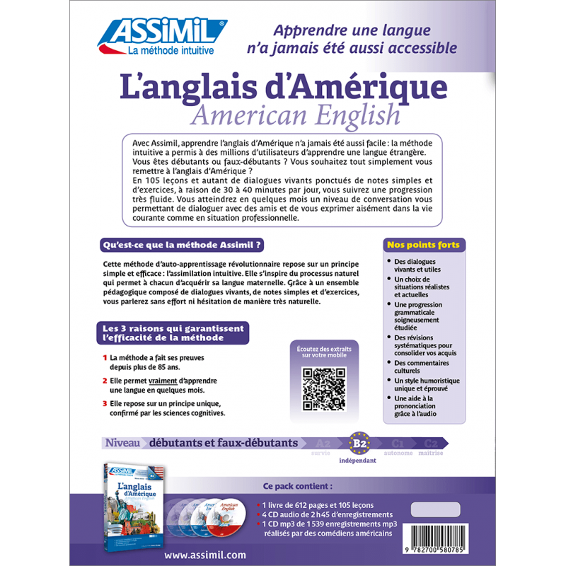 Si l'anglais britannique et l'anglais américain présentent des similitudes, ces deux langues sœurs offrent bien des différences, notamment au niveau de la prononciation et du lexique. Si vous projetez un séjour aux États-Unis ou si vous devez travailler en américain, l'anglais britannique ne sera pas suffisant. En nous suivant attentivement – et régulièrement – vous apprendrez en quelques mois le vocabulaire de la langue courante, ainsi que les règles fondamentales de la grammaire. Très rapidement, l'anglais d'Amérique vous semblera familier, grâce à une centaine de dialogues tirés de la vie quotidienne que nous vous présentons dans ce coffret, sur CD audio et CD mp3.