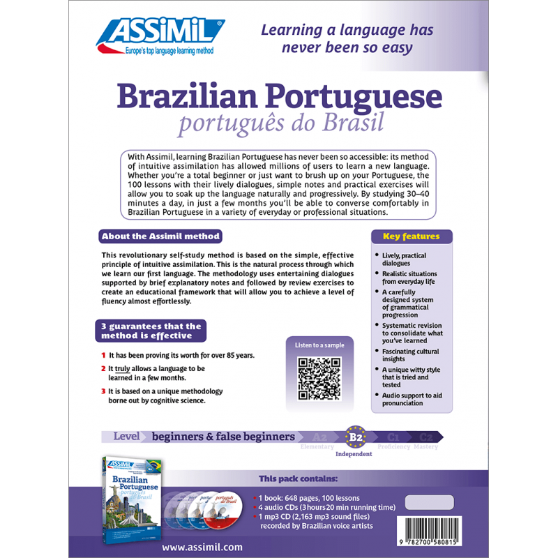 Cette méthode vous propose de découvrir le portugais parlé au Brésil dans ses particularités lexicales (mots d’origine tupi ou africaine), phonétiques et grammaticales. Vous découvrirez une langue plurielle, fortement marquée par l’héritage culturel d’un peuple métissé, mais en constante évolution.