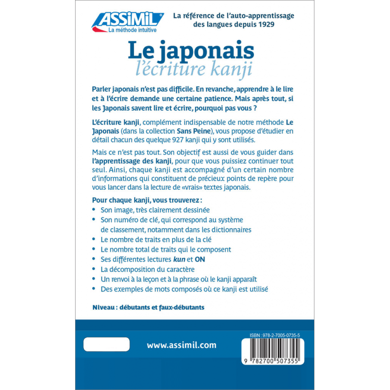 Le japonais est la deuxième langue la plus traduite dans l’espace francophone après l’anglais. Le japonais kanji, complémentaire à la méthode, vous fait découvrir pas à pas, les caractères chinois de l’écriture japonaise. Outre la découverte de l’art calligraphique, l’écriture est également un outil supplémentaire à la mémorisation de la langue.