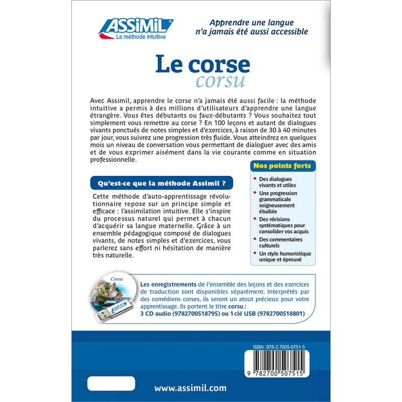 Vous trouverez ici une langue authentique, des dialogues vivants, tels que l’on pourrait les surprendre ici ou là en se mêlant aux habitants de l’île. En vous conformant aux prescriptions de la méthode, régularité et persévérance, écoute attentive et répétitive des enregistrements si vous en disposez, respect des deux "vagues" du parcours, vous atteindrez au terme de votre étude une aisance dans la langue qui, même si elle devait être jugée imparfaite par d’exigeants autochtones, vous sera un sésame incontestable pour accéder au monde des corsophones.