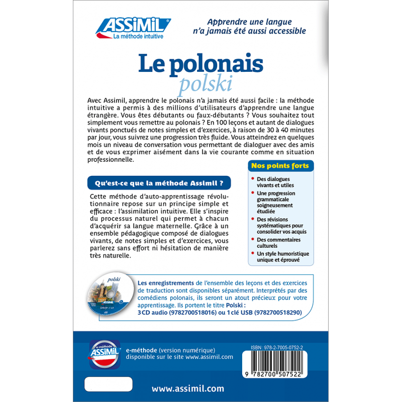 Le polonais est une langue slave occidentale qui compte près de 55 millions de locuteurs. Cette méthode, complètement remise à jour, tient compte des évolutions que le pays a connues ces dernières années sur le plan économique et technologique. Elle permet en 100 leçons et quelques mois de maîtriser le langage quotidien pour échanger avec les francophiles polonais.
