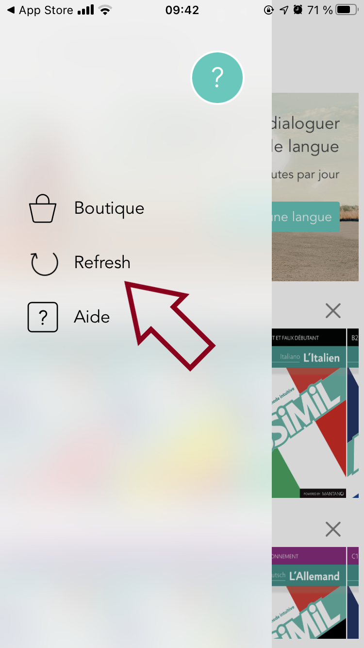 Déconnectez-vous puis reconnectez-vous avec l’adresse de messagerie associée à votre licence. Il s’agit généralement de l’adresse e-mail utilisée lors de votre achat sur le Google Play Store, l'App Store ou Bookari Store, ou lors de l’enregistrement de votre code de livraison sur le site de livraison https://monachat.assimil.online si vous avez acheté votre e-méthode sur assimil.com ou bien via un pack Applivre.