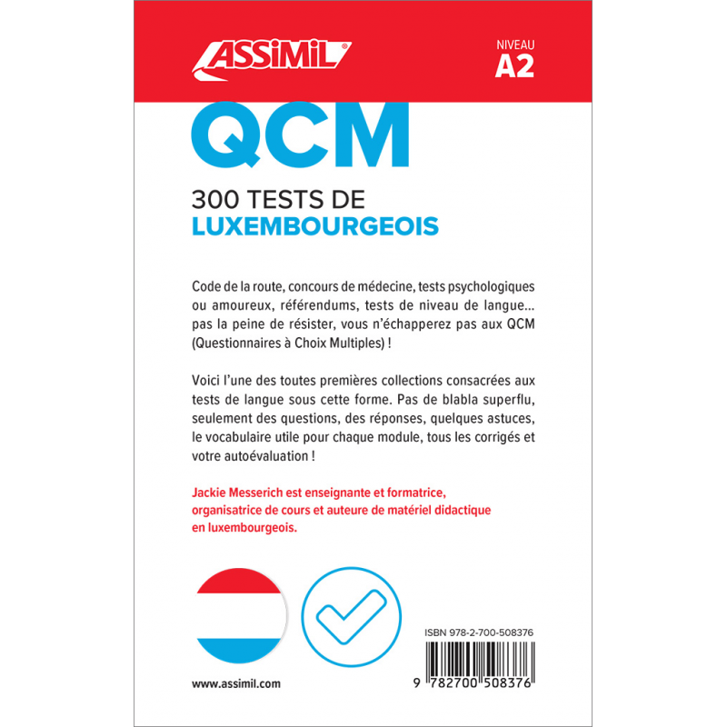 Envie de vous tester en luxembourgeois ? Les Questionnaires à Choix Multiple (QCM) permettent, de façon rapide et ludique, de vous évaluer en luxembourgeois. Cet ouvrage compact et facile à emporter dans les transports présente 300 tests correspondant au niveau A2 du Cadre Européen Commun de Référence pour les Langues (CECRL).